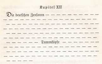 At the head of reactionary authority in Germany in the early nineteenth century was Chancellor Metternich, who campaigned to suppress liberal tendencies by introducing pre-censorship, whereby potentially actionable works were to be submitted before publication. The best-known victims of these restrictions were Georg Büchner and Heinrich Heine, whose works included many tirades against censorship. Heine ridiculed the censors in Chapter 12 of his 1826 Reisebilder (Travel Pictures), which has all the text pre-censored except for the opening words ‘Die deutschen Zensoren’ (The German censors) and the word ‘Dummköpfe’ (fools) .