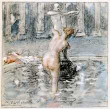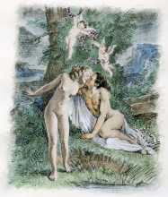 Today we have not one but two new portfolios illustrating René Boylesve’s La leçon d’amour dans un parc (Love Lesson in a Park), featuring an alluring male statue and lots of naked women. Umberto Brunelleschi’s 1933 version is here, and Antoine Calbet’s from 1942 here. Enjoy!